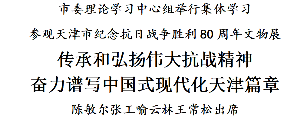 9月4日,市委理论学习中心组举行集体学习,赴天津博物馆参观“津沽烽火 浩气长歌——天津市纪念抗日战争胜利80周年文物展”,深入学习贯彻习近平总书记在纪念中国人民抗日战争暨世界反法西斯战争胜利80周年大会上的重要讲话精神,传承和弘扬伟大抗战精神,厚植爱国情怀,坚定必胜信心,以更加昂扬的姿态奋力谱写中国式现代化天津篇章。