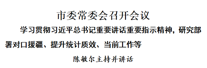 本报讯(记者 于春沣 刘国栋)9月28日,市委常委会召开会议,学习贯彻习近平总书记关于中国人民抗日战争暨世界反法西斯战争胜利80周年纪念活动的重要讲话和亲切接见纪念活动筹办工作各方面代表时的重要讲话精神、在听取新疆维吾尔自治区党委和政府工作汇报及出席新疆维吾尔自治区成立70周年有关庆祝活动时的重要讲话精神,学习习近平总书记关于统计工作的重要论述,听取我市开展统计督察工作情况及下一步安排汇报,研究部署有关工作。市委书记陈敏尔主持会议并讲话。