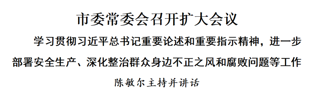本报讯(记者 于春沣 刘国栋)10月30日,市委常委会召开扩大会议,学习贯彻习近平总书记关于安全生产的重要论述和重要指示精神,听取全市群众身边不正之风和腐败问题集中整治工作情况汇报,进一步部署全市安全生产、深化集中整治等工作。