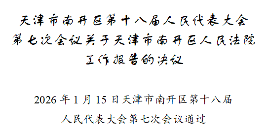 天津市南开区第十八届人民代表大会第七次会议,听取和审议了白云飞代理院长所作的工作报告。会议充分肯定区人民法院过去一年的工作,同意报告提出的2026年工作安排,决定批准这个报告。
