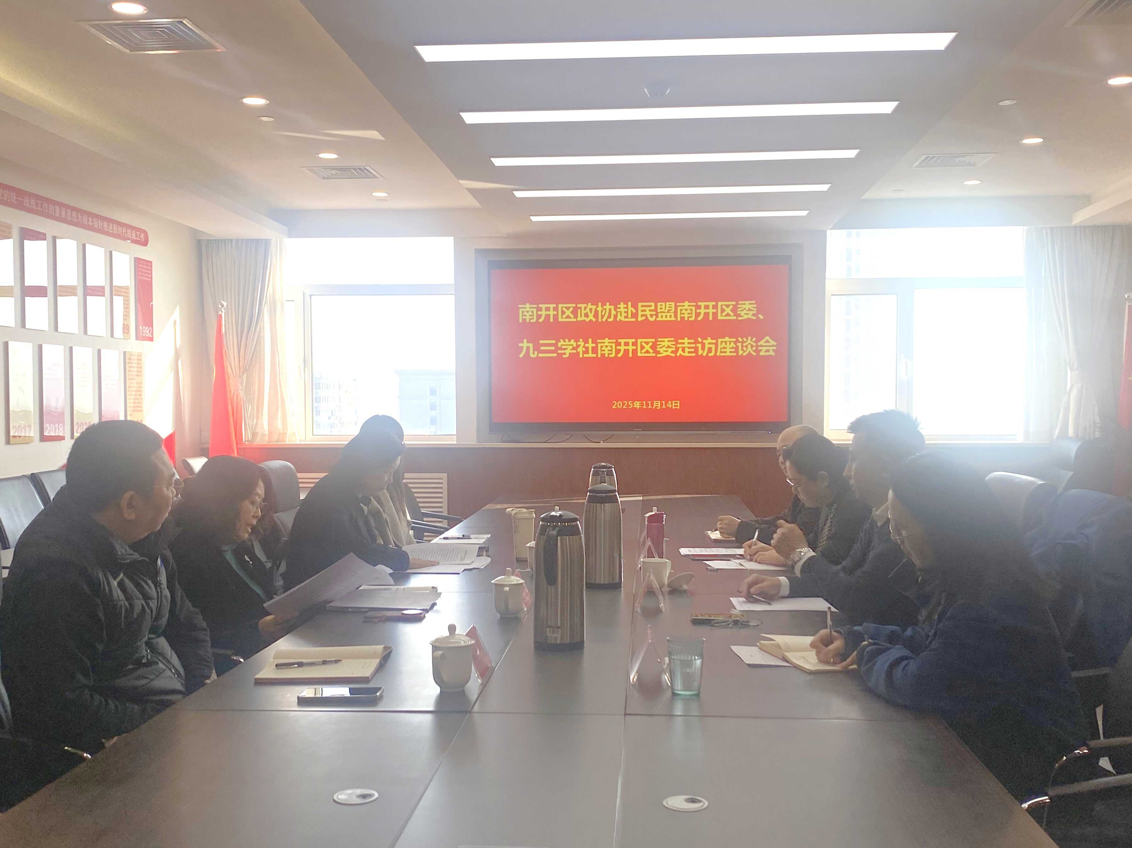 11月13日上午,区政协副主席赵萍带队走访九三学社和民盟南开区委员会。区政协副主席、九三学社南开区委主委祖炳锋,民盟南开区委副主委刘燕、左勇等党派负责同志参加活动。