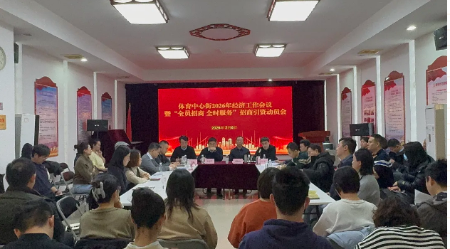 为深入贯彻落实市委、区委经济工作会议精神,近日,体育中心街召开2026年经济工作会议暨“全员招商 全时服务”招商引资动员会,推动引领全街上下聚焦经济建设这一中心工作和高质量发展这一首要任务,完整准确全面贯彻新发展理念,积极服务和融入构建新发展格局。会议邀请区发展和改革委员会、区投资促进局相关负责同志出席,街道处级领导班子成员,科室负责人,各社区党组织书记及部分企业代表参加。