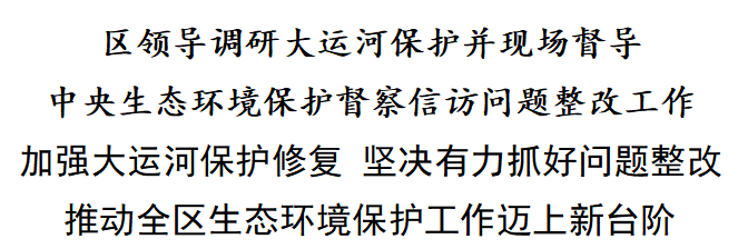 朱玉兵强调,大运河是十分宝贵的文化遗产、大运河文化是中国优秀传统文化的重要组成部分,要坚持在保护中发展、在发展中保护,全面落实属地责任、部门监管责任,加强水质监测,强化日常巡护、宣传教育,标本兼治确保常态长效。把大运河文化遗产保护同生态环境保护提升、文化旅游融合发展统一起来,让古老大运河焕发时代新风貌。坚持目标导向、问题导向、效果导向,诚恳接受、主动认领中央生态环境保护督察通报的问题,深入剖析问题根源,细化实化任务清单、责任主体,持续加强专班调度、跟踪督办,推动整治取得明显成效。研究谋划我区“十五五”时期生态环境保护的目标任务、重点项目和保障措施,树牢绿色发展理念,优化产业结构,协同推进降碳、减污、扩绿、增长,持续打好蓝天、碧水、净土保卫战,为人民群众创造天更蓝、地更绿、水更清的良好环境。