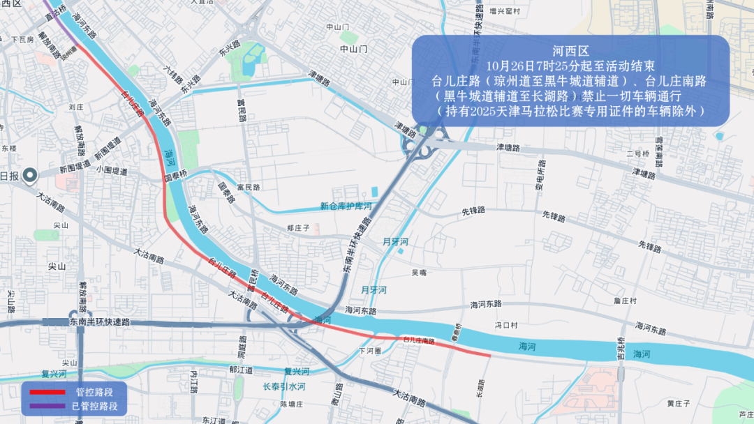 (四)2025年10月26日7时25分起,台儿庄路(琼州道至黑牛城道辅道)、台儿庄南路(黑牛城道辅道至长湖路)禁止一切车辆通行(持有2025天津马拉松比赛专用证件的车辆除外)。过往社会车辆可绕行解放南路、大沽南路、黑牛城道等道路。