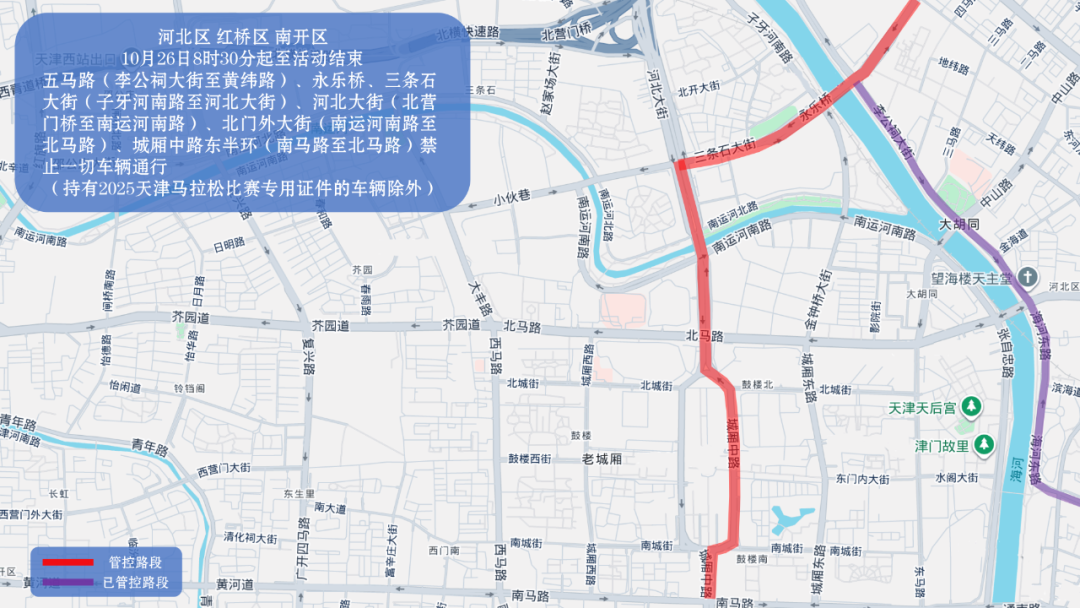 (九)2025年10月26日8时30分起,五马路(李公祠大街至黄纬路)、永乐桥、三条石大街(子牙河南路至河北大街)、河北大街(北营门桥至南运河南路)、北门外大街(南运河南路至北马路)、城厢中路东半环(南马路至北马路)禁止一切车辆通行(持有2025天津马拉松比赛专用证件的车辆除外)。过往社会车辆可绕行黄纬路、北横快速路、子牙河南路、金钟桥大街、小伙巷、大丰路、光荣道、西青道、城厢东路、东马路、南门外大街等道路。