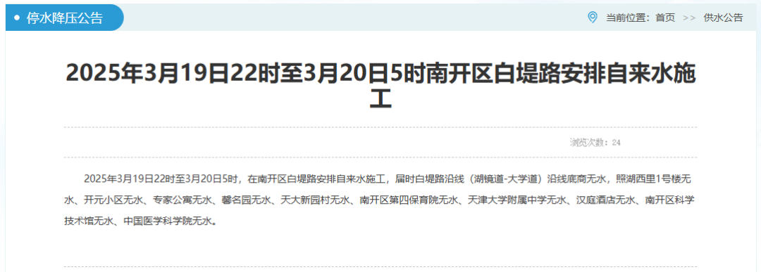 2025年3月19日22时至3月20日5时,在南开区白堤路安排自来水施工,届时白堤路沿线(湖镜道-大学道)沿线底商无水,照湖西里1号楼无水、开元小区无水、专家公寓无水、馨名园无水、天大新园村无水、南开区第四保育院无水、天津大学附属中学无水、汉庭酒店无水、南开区科学技术馆无水、中国医学科学院无水。