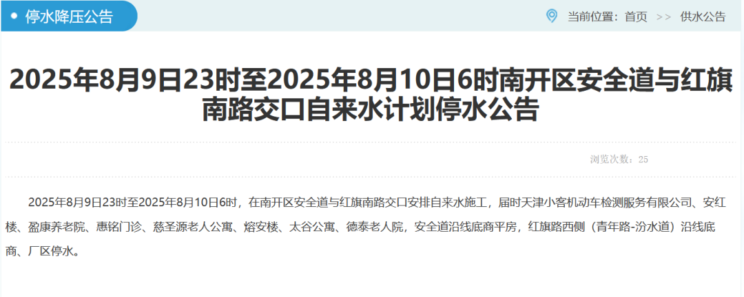 2025年8月9日23时至2025年8月10日6时,在南开区安全道与红旗南路交口安排自来水施工,届时天津小客机动车检测服务有限公司、安红楼、盈康养老院、惠铭门诊、慈圣源老人公寓、熔安楼、太谷公寓、德泰老人院,安全道沿线底商平房,红旗路西侧(青年路-汾水道)沿线底商、厂区停水。