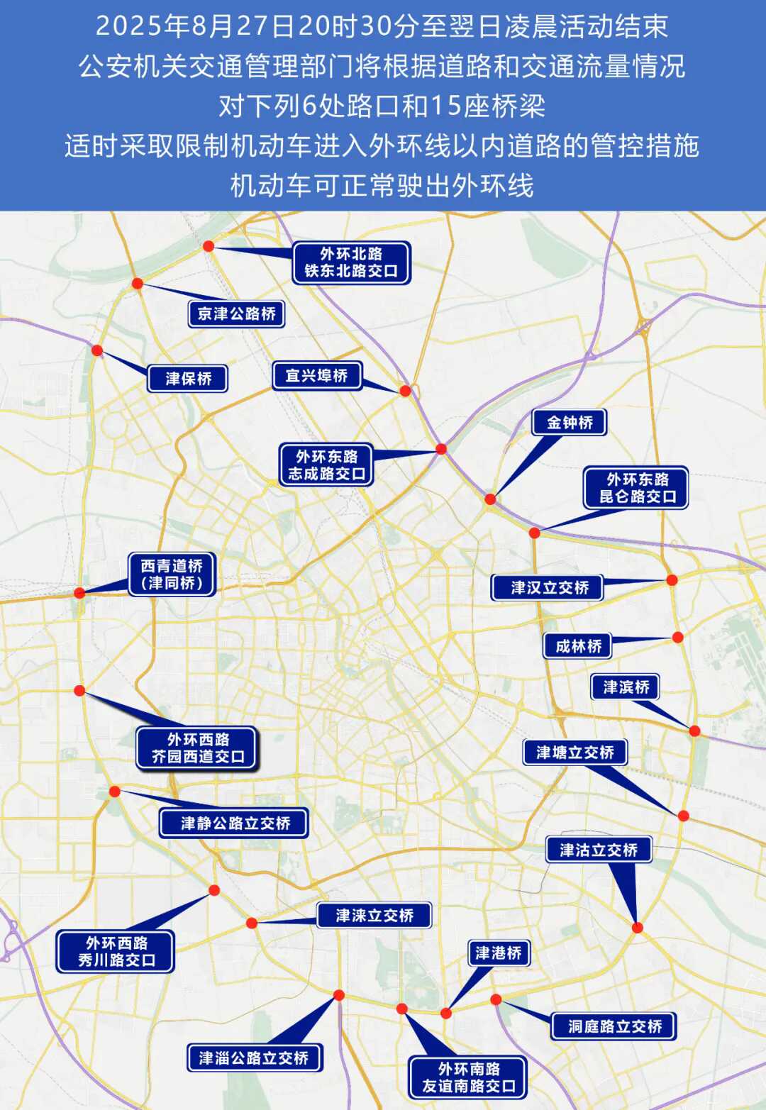 一、自2025年8月27日20时30分至翌日凌晨活动结束,公安机关交通管理部门将根据道路和交通流量情况,对外环东路与昆仑路交口、外环南路与友谊南路交口、外环西路与秀川路交口、外环西路与芥园西道交口、外环北路与铁东北路交口、外环东路与志成路交口等6处路口,金钟桥、津汉立交桥、成林桥、津滨桥、津塘立交桥、津沽立交桥、洞庭路立交桥、津港桥、津淄公路立交桥、津涞立交桥、津静公路立交桥、西青道桥(津同桥)、津保桥、京津公路桥、宜兴埠桥等15座桥梁,适时采取限制机动车进入外环线以内道路的管控措施。机动车可正常驶出外环线。