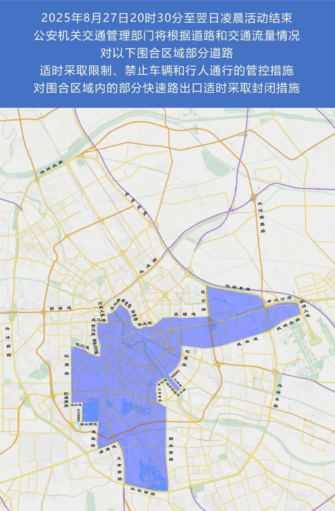 二、自2025年8月27日20时30分至翌日凌晨活动结束,公安机关交通管理部门将根据道路和交通流量情况,对解放南路、大沽南路、奉化道、大直沽西路、海河东路、东兴路、六纬路、大直沽西路、红星路、成林道、机场北路、机场大道、津汉公路、外环东路、昆仑路、真理道、新阔路、华龙道、新广路、金纬路、黄纬路、五马路、三条石大街、河北大街、北门外大街、北马路、西马路、南开三马路、长江道、红旗路、红旗南路、迎水道、水上公园西路、宾水西道、凌宾路、津涞道、卫津南路、外环南路围合区域部分道路,适时采取限制、禁止车辆和行人通行的管控措施;对围合区域内的部分快速路出口,适时采取封闭措施。