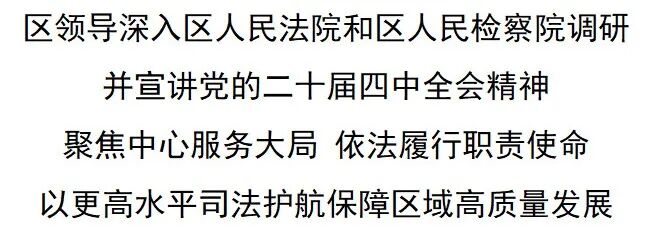 南开融媒 11月15日,区委书记朱玉兵深入区人民法院和区人民检察院调研并宣讲党的二十届四中全会精神。他强调,要深入学习贯彻党的二十届四中全会精神,全面落实习近平总书记视察天津重要讲话精神,聚焦中心服务大局,依法履行职责使命,以更高水平司法护航保障区域高质量发展。