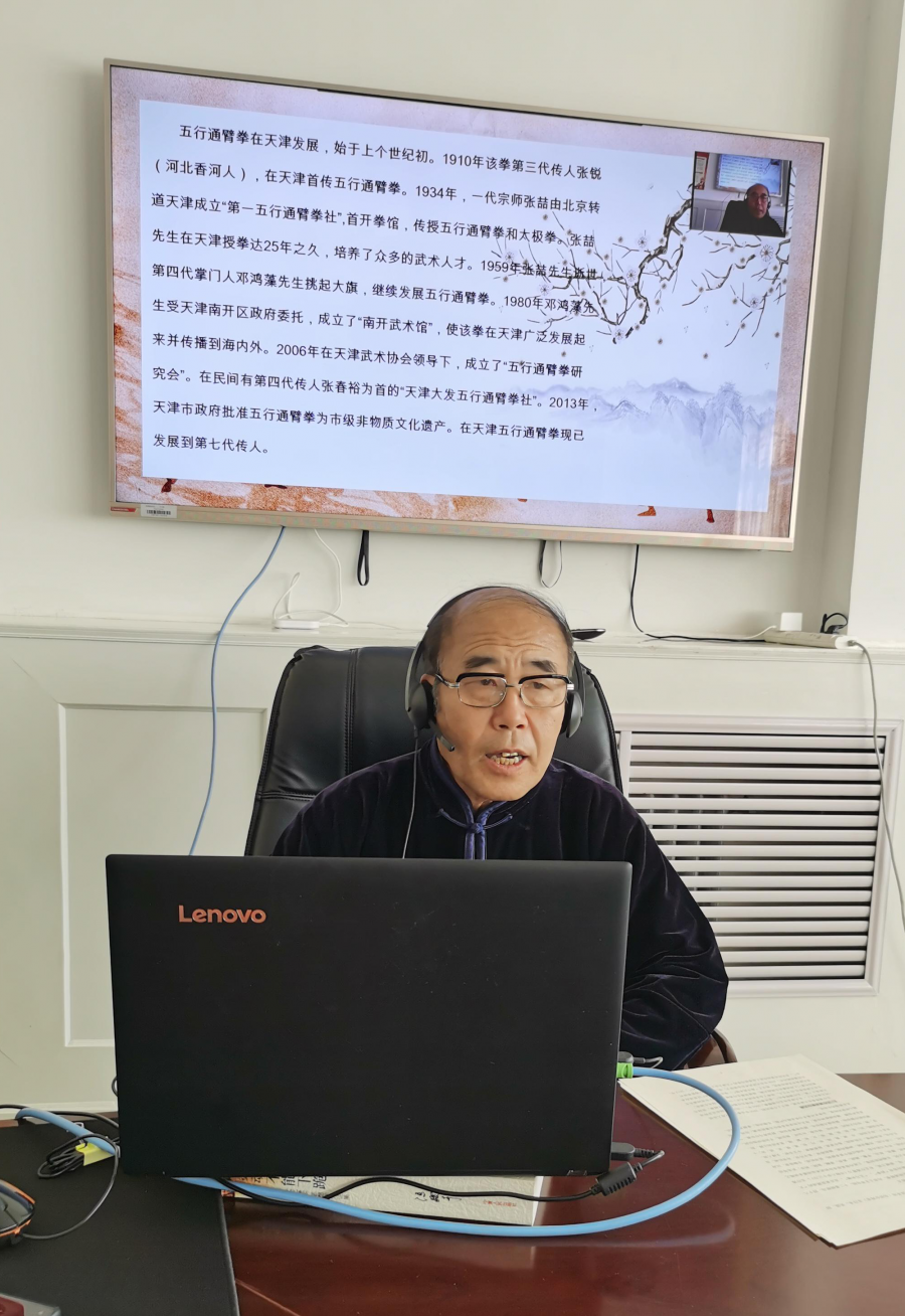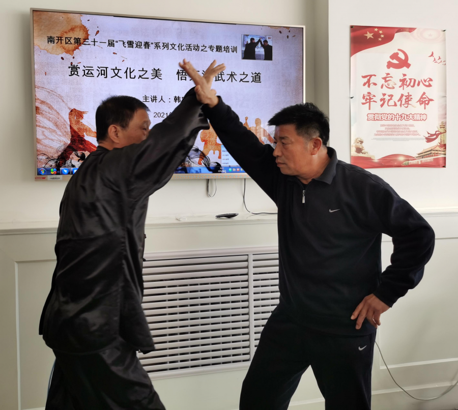 此次讲座邀请到天津市非物质文化遗产代表性项目——五行通臂拳第五代传承人、中国武术协会会员、中国武术八段、国家一级体育运动指导员、天津武术协会通臂拳研究会秘书长韩宝顺老师主讲。培训内容分别从大运河的发展历史及对经济文化发展的重要意义、大运河与天津武术文化渊源、五行通背拳与天津、今天的五行通背拳及其价值所在等四个方面进行了讲述。