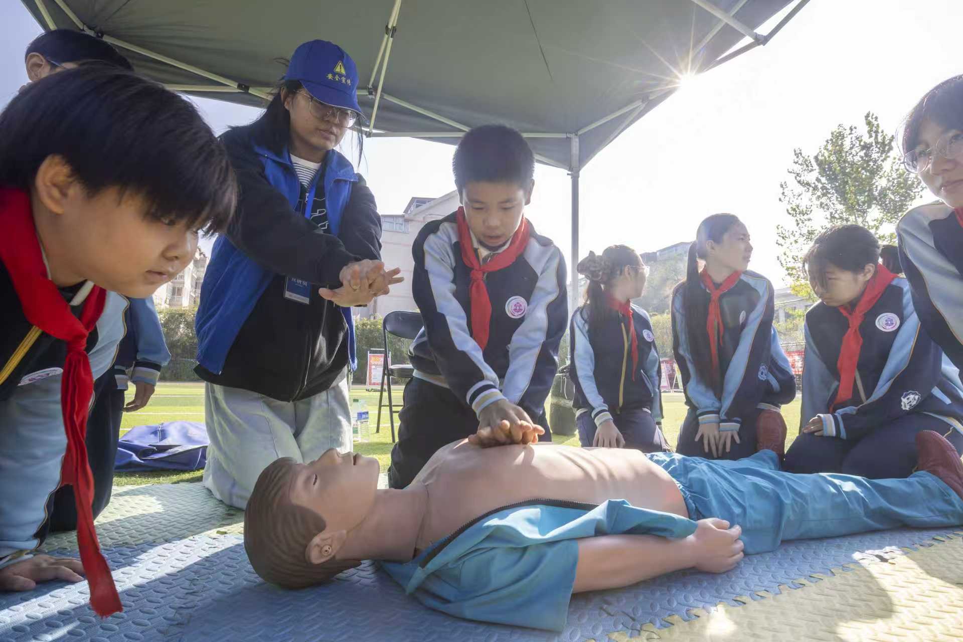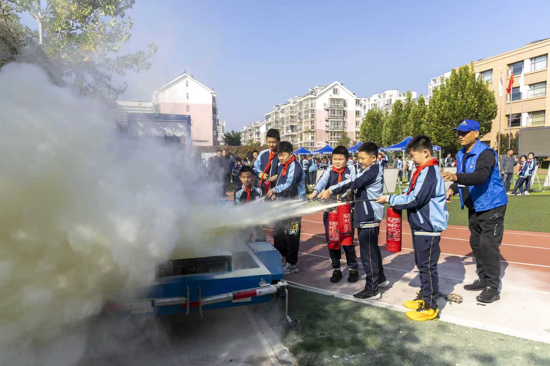 在灭火器实操演练环节,在专业人员的指导下,师生代表们轮流上阵,手提干粉灭火器,对准模拟火源进行扑救,熟练掌握了“提、拔、握、压”的操作步骤。刚刚参加完灭火演练的学生李雨萌兴奋地表示:“今天的活动太有意思了,而且非常实用!我不仅学会了怎么用心肺复苏帮助别人,还知道了火灾、地震来了该怎么保护自己,收获特别大!”