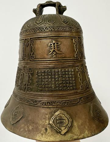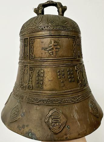 这口寒山寺小铜钟为清光绪年间仿制唐钟样式铸造,可悬挂或手持,通体散发着岁月浸润的光泽,是集工艺、宗教与历史价值于一体的珍品。